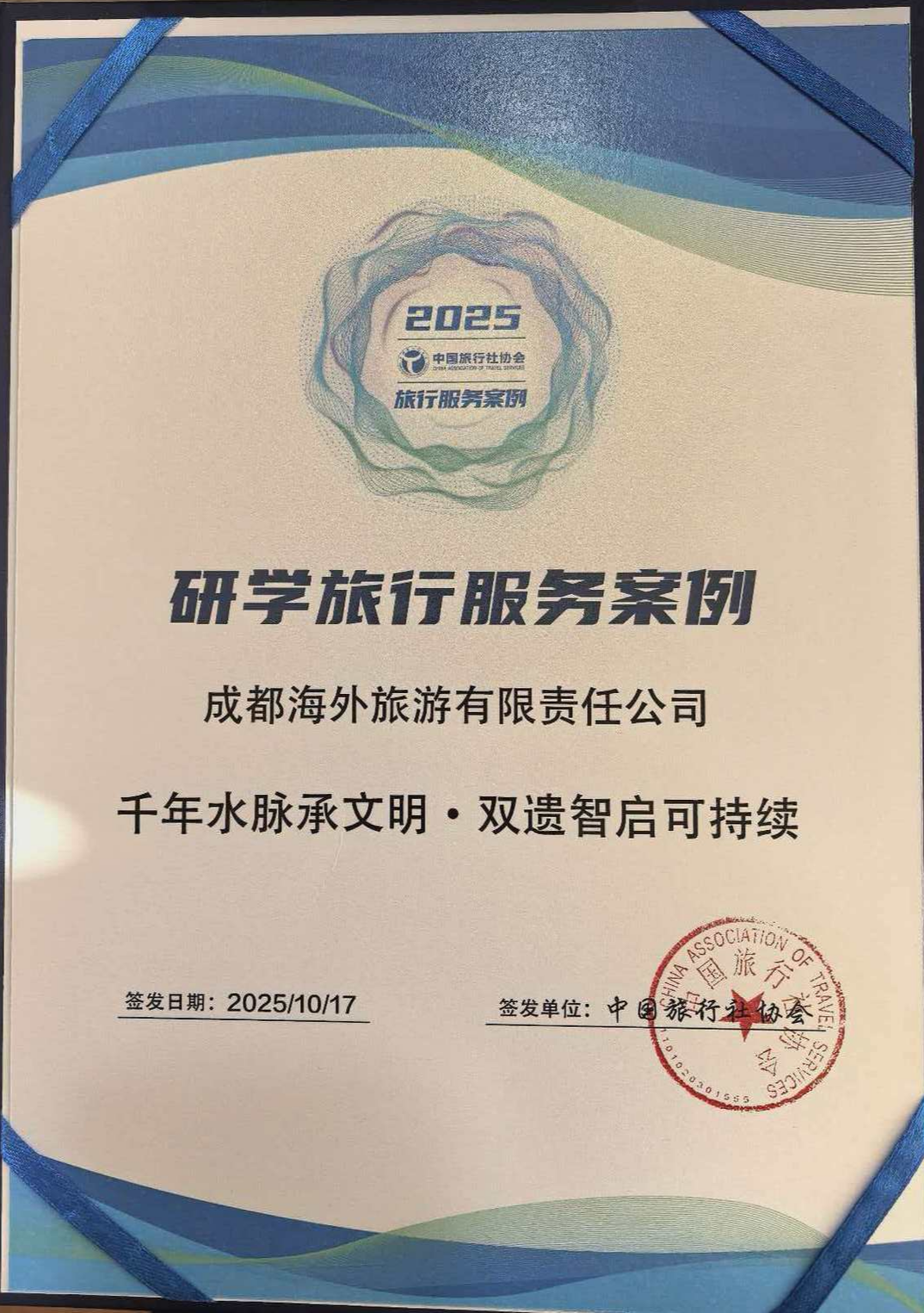 首批被四川省政府审定为四川省重点旅行社,四川省旅游骨干企业,并被成都市旅游局授予“成都市日本入境旅游市场总代理”。